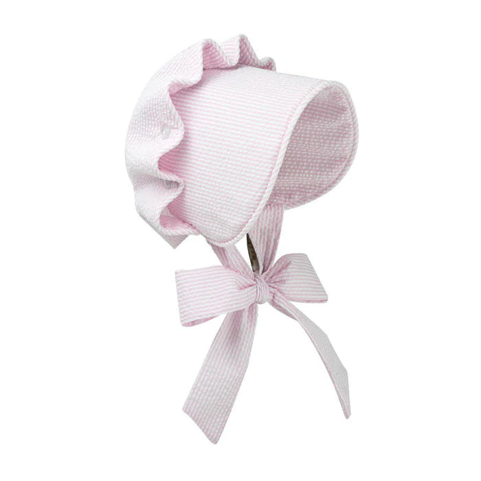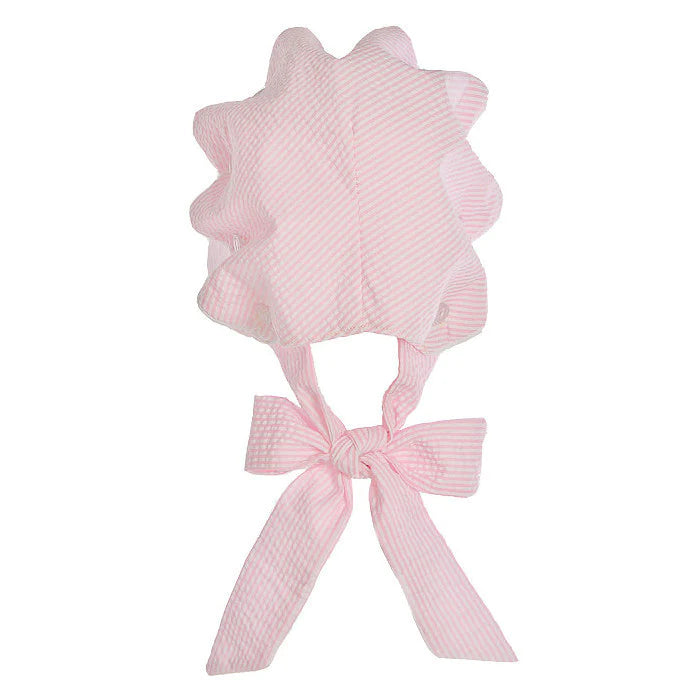 The Savannah Pink Seersucker Beaufort Bonnet is our second most popular selling Beaufort Bonnet. Not only is it pretty as pink can be; it's practical and machine washable. People always ask us what color they should select to monogram this little gem; truthfully, every color looks cute on it! A preppy pink seersucker baby bonnet- what more could a baby girl ask for?
