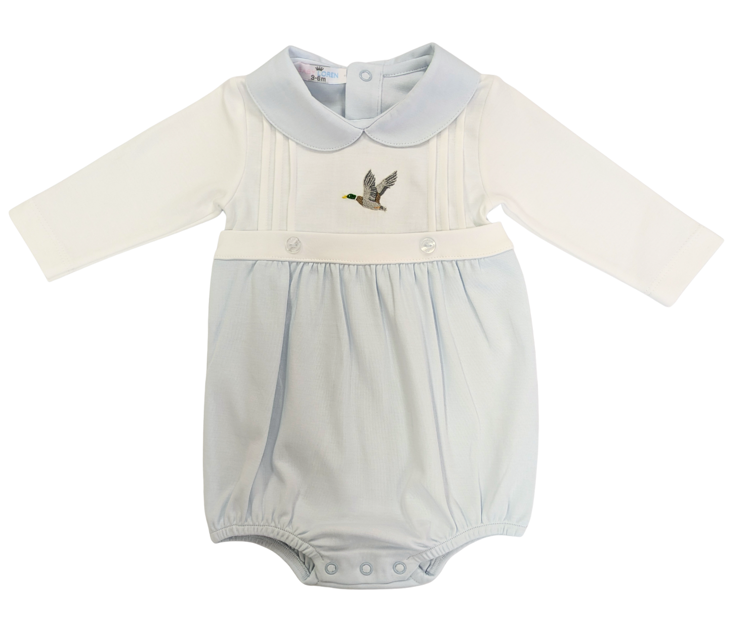 Set sail with the Blue Mallard Ducks Hand Embroidered Bubble. This charming long-sleeve one-piece features a beautifully hand-embroidered flying mallard in a crisp white and blue palette. The rounded collar frames the face sweetly while keeping little ones cozy through cooler months. Perfect for outdoor adventures, family gatherings, or everyday play, this playful bubble combines classic style with nature-inspired details that parents and kids adore.