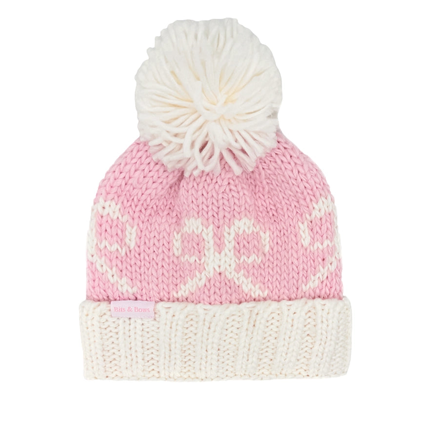 The Bows Bobble Hat is a sweetly hand-stitched style with our signature motif in a cozy, cute, classic color and pattern designed to warm up little ones' heads and bring childhood magic to life with its every wear. Each features the softest acrylic knit, a fun pom-pom on top, and a cuff that can be customized with name or monogram embroidery to make it extra special. Two precious pastel colorways of hats pair perfectly with our Knit Mittens for endless snowball fights and outdoor adventures all holiday season long.
