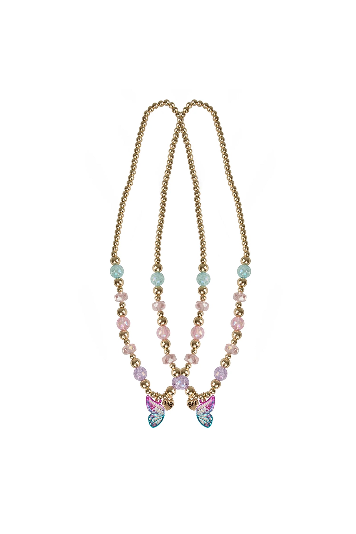 Share the love with your bestie with our Butterfly Wishes BFF necklaces! This set includes two gold toned beaded necklaces, with half a butterfly pendant with a gold BFF heart on each. Our children's jewelry is strung with double the elastic to add extra durability.