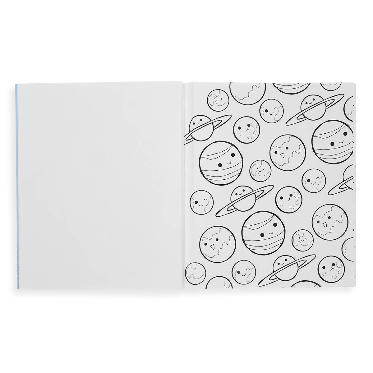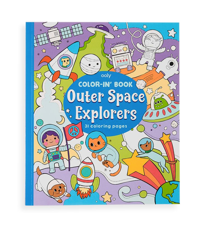 Intergalactic 31 page Outer Space Explorers Coloring Book for kids with fun and futuristic designs, complete with perforated pages for easy framing and gifting.