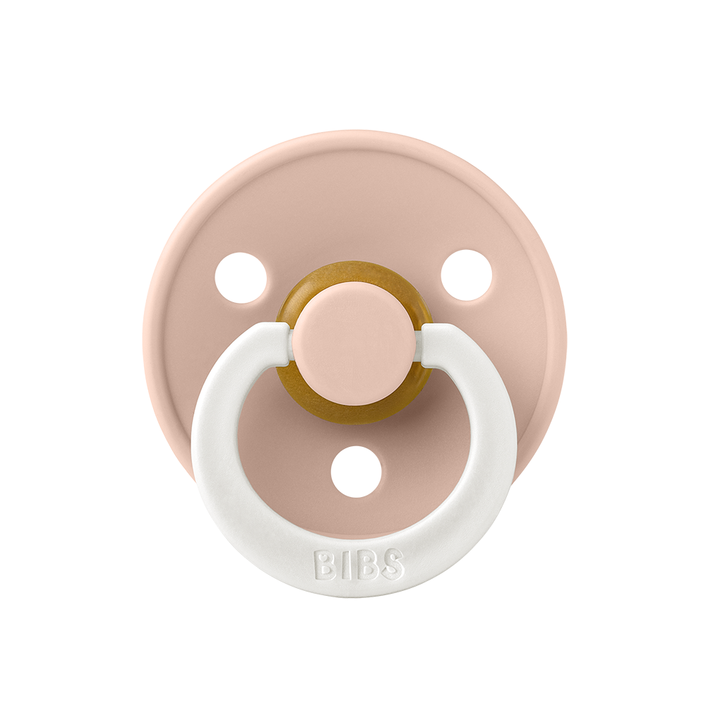 Our Colour pacifier is the original BIBS pacifier and has been on the market for over 40 years. It has the signature round BIBS shield with three vent holes and round BIBS engraved handle ring.
