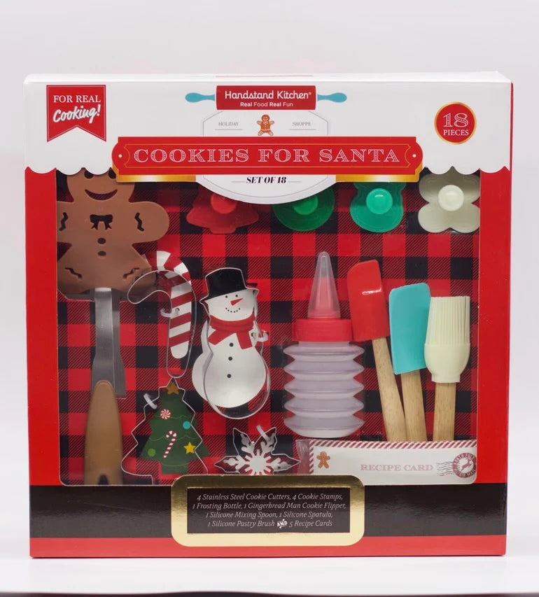 Make holiday baking a family tradition with our deluxe Cookies for Santa baking set! This 18 piece set for real kitchen use has everything needed to bake dozens of festive cookies for Santa, for holiday parties, or just for fun, anytime!