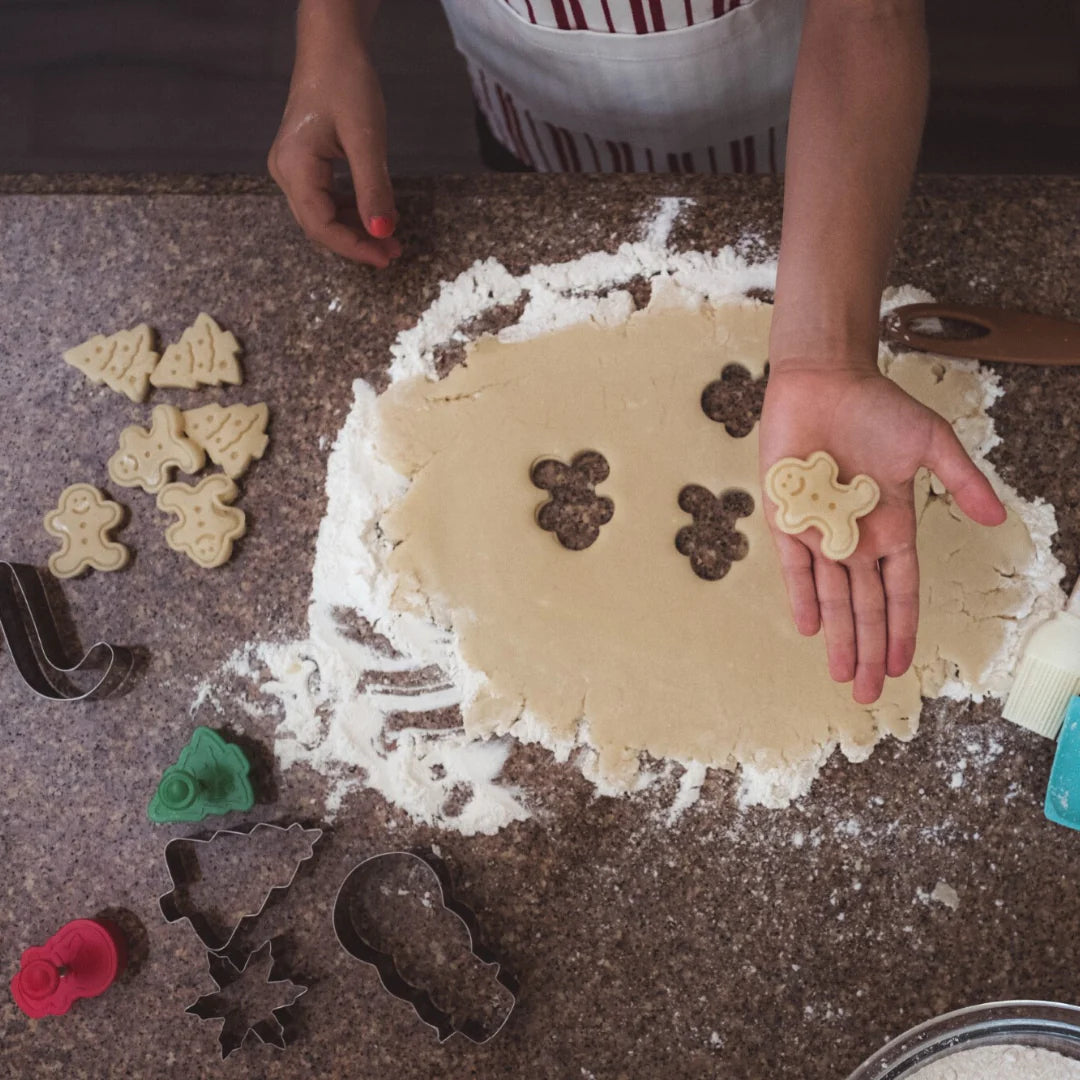 Includes: 4 stainless steel cookie cutters, 4 cookie stamps, 1 frosting bottle with tip and cap, 1 gingerbread man cookie flipper, 1 silicone mixing spoon, 1 silicone spatula, 1 silicone pastry brush and recipes.
