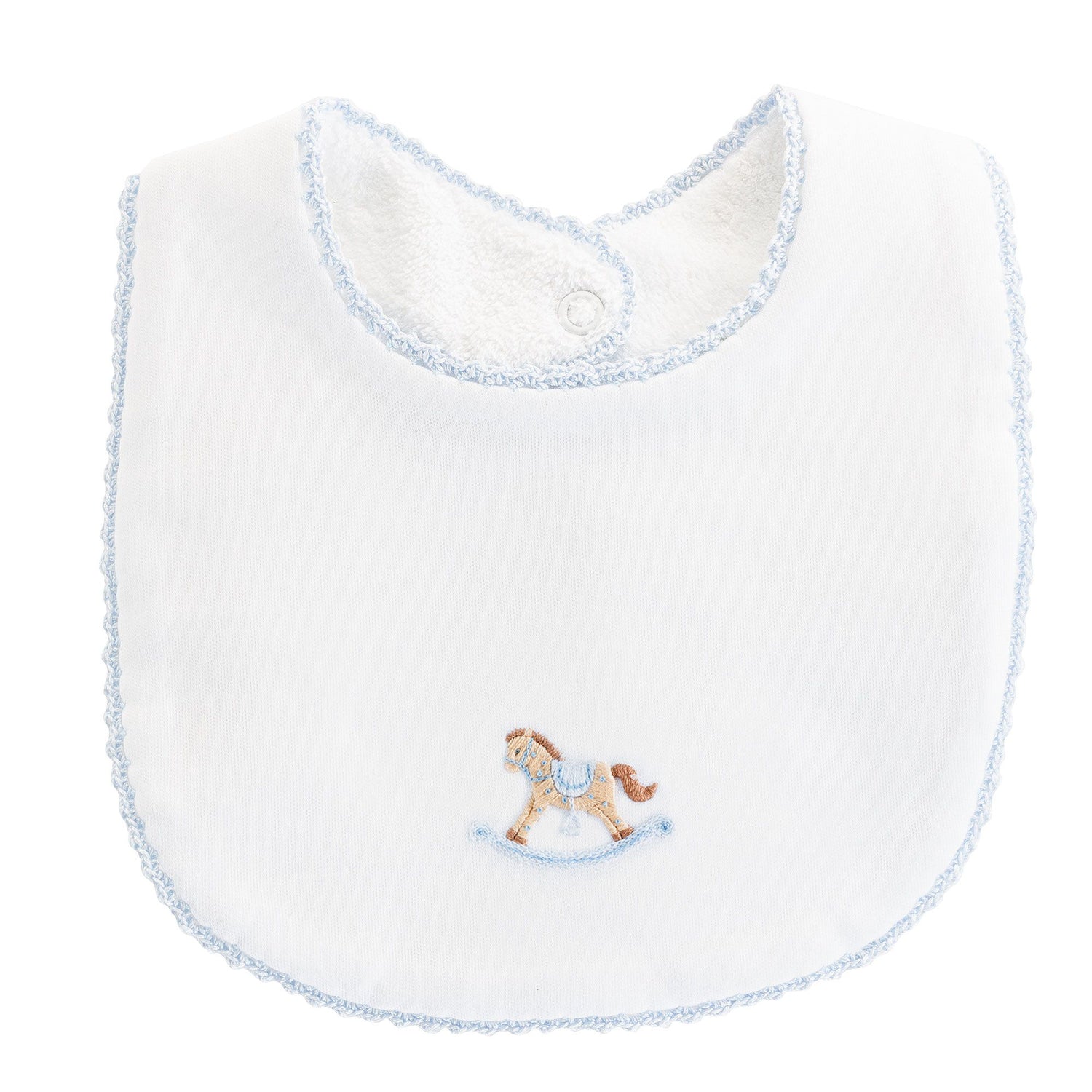 Cute Rocking Horse Embroidered Bib with Crochet Trim