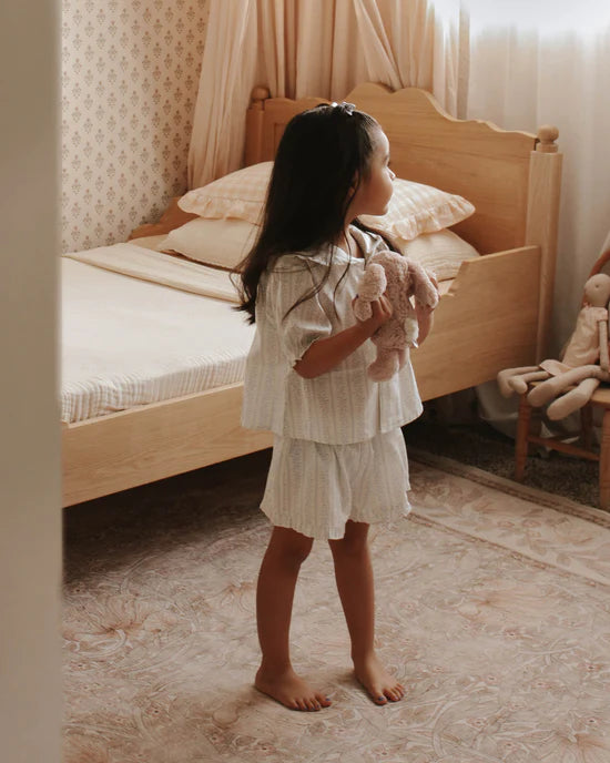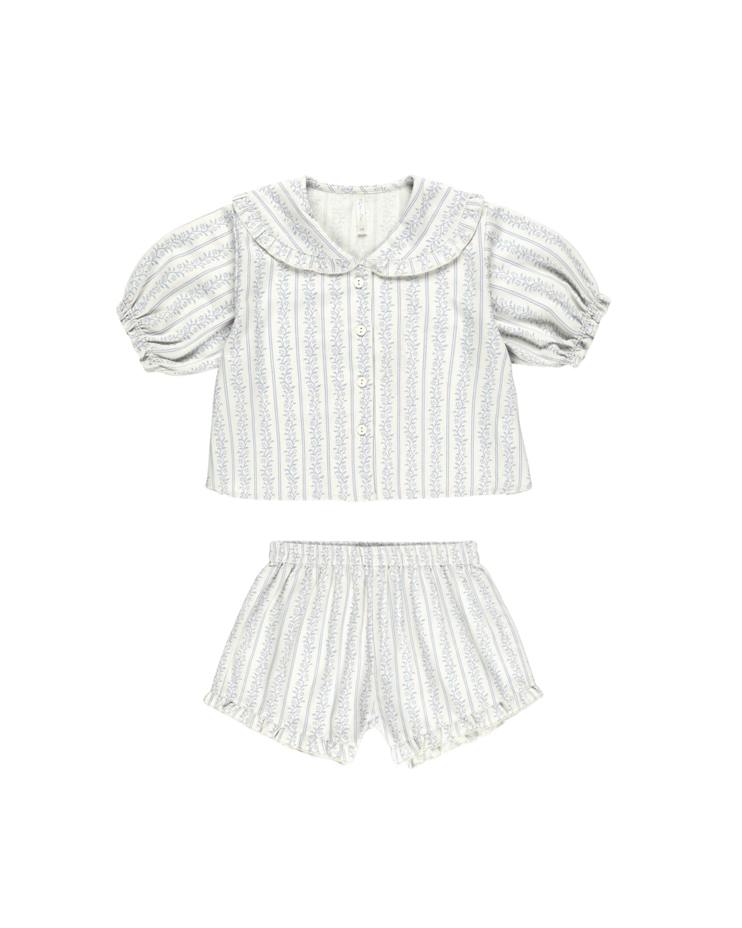The Delilah Pajama Set is bringing old charm to your sleep and loungewear - with an elegant ruffle collar, gathered sleeves, and darling button and ruffle detail.