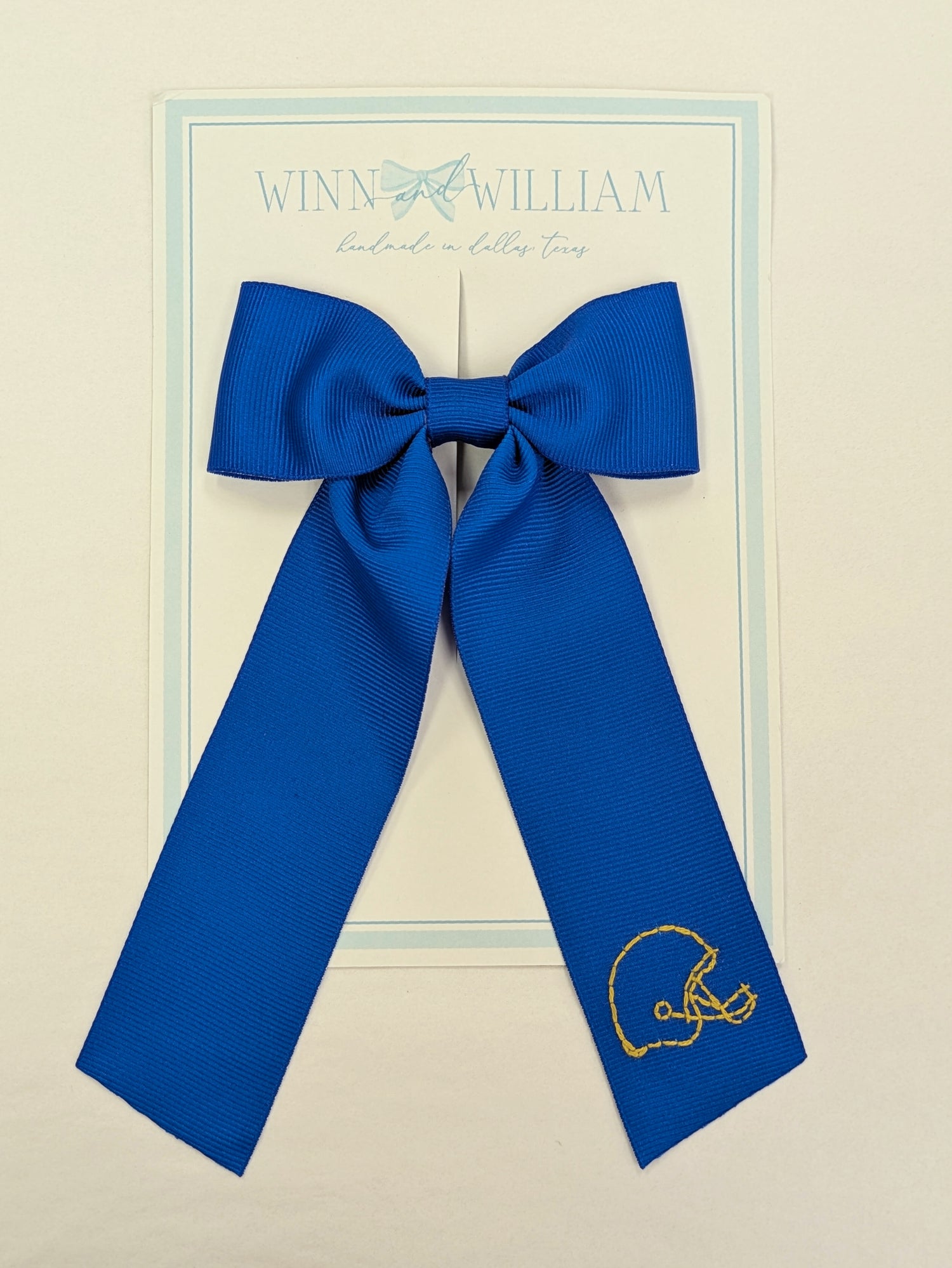 Embroidered football helmet hair bow on royal gros grain ribbon on alligator clip