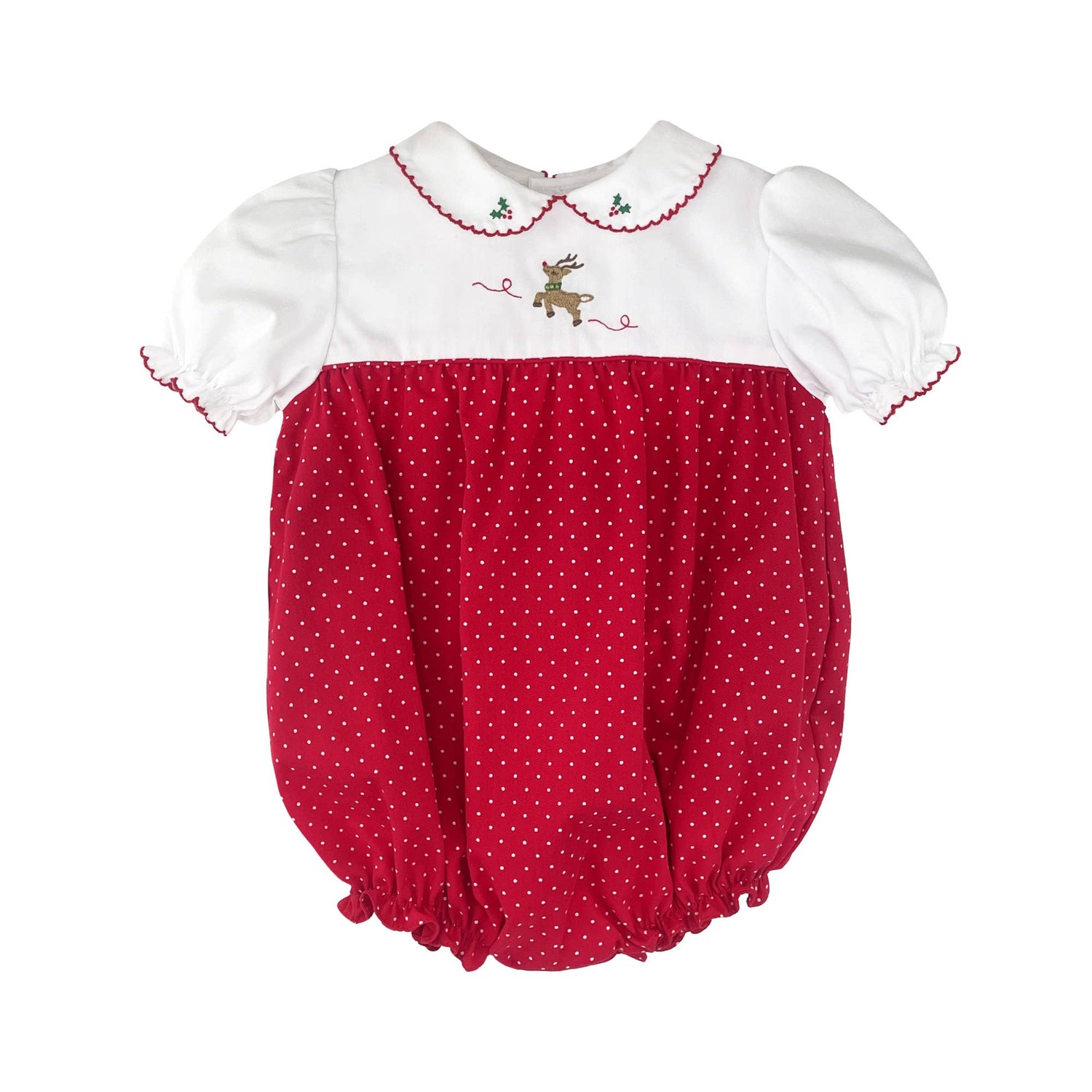 This bubble comes with a short sleeve white top with a hand embroidered reindeer design with a red dot print bottom. Red picot trimmed edges and holly embroidered peter pan collar adds a touch of detail.