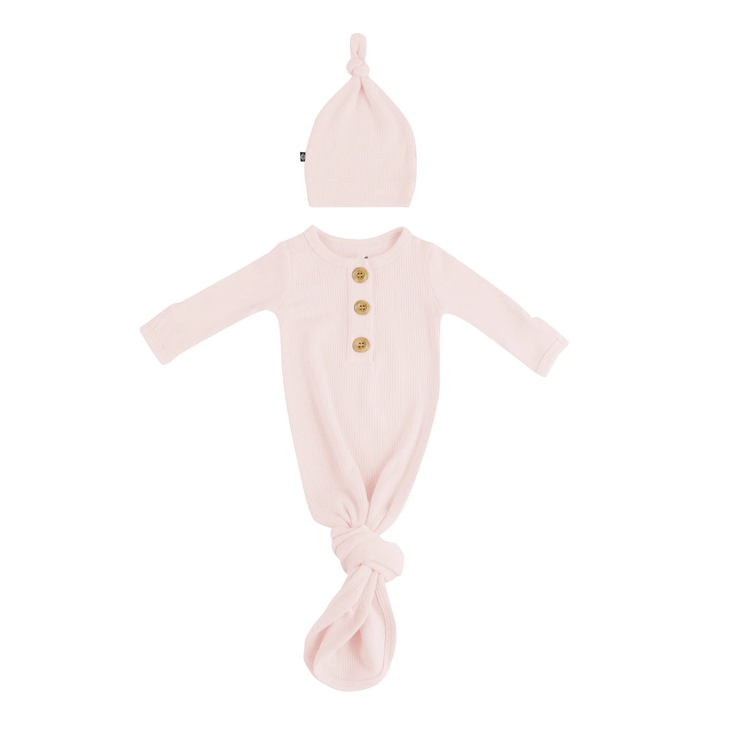 This knotted gown is made from snuggly soft bamboo fabric that’s gentle on your newborn’s delicate skin, and perfectly stretchy for hip-healthy movement. A tie bottom design makes diaper changes a breeze, while wooden buttons on the front add adorable charm. A matching knotted cap is the finishing touch to a picture-perfect look to announce your little one’s arrival.