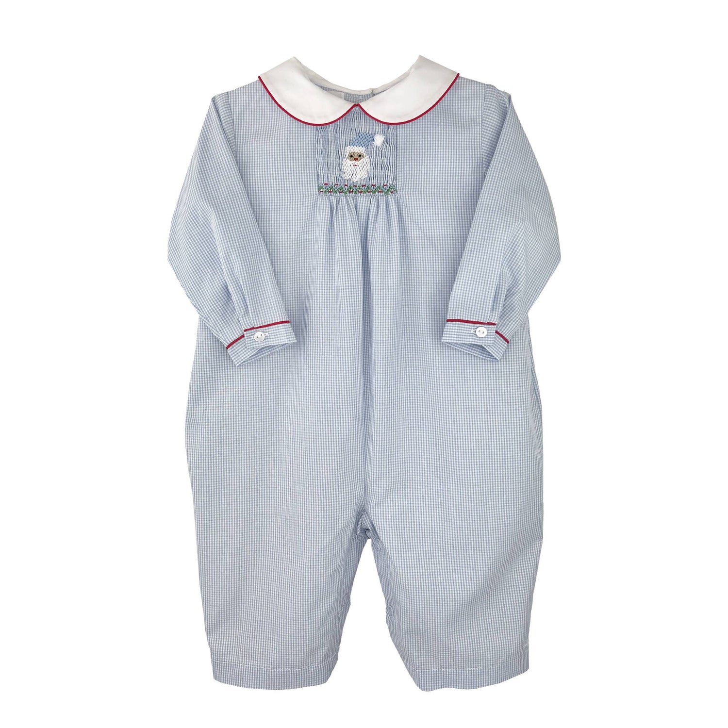 This long sleeve romper comes in a light blue check fabric with a Santa hand picture smocked insert and red trimmed edges. A white peter pan collar completes the look.
