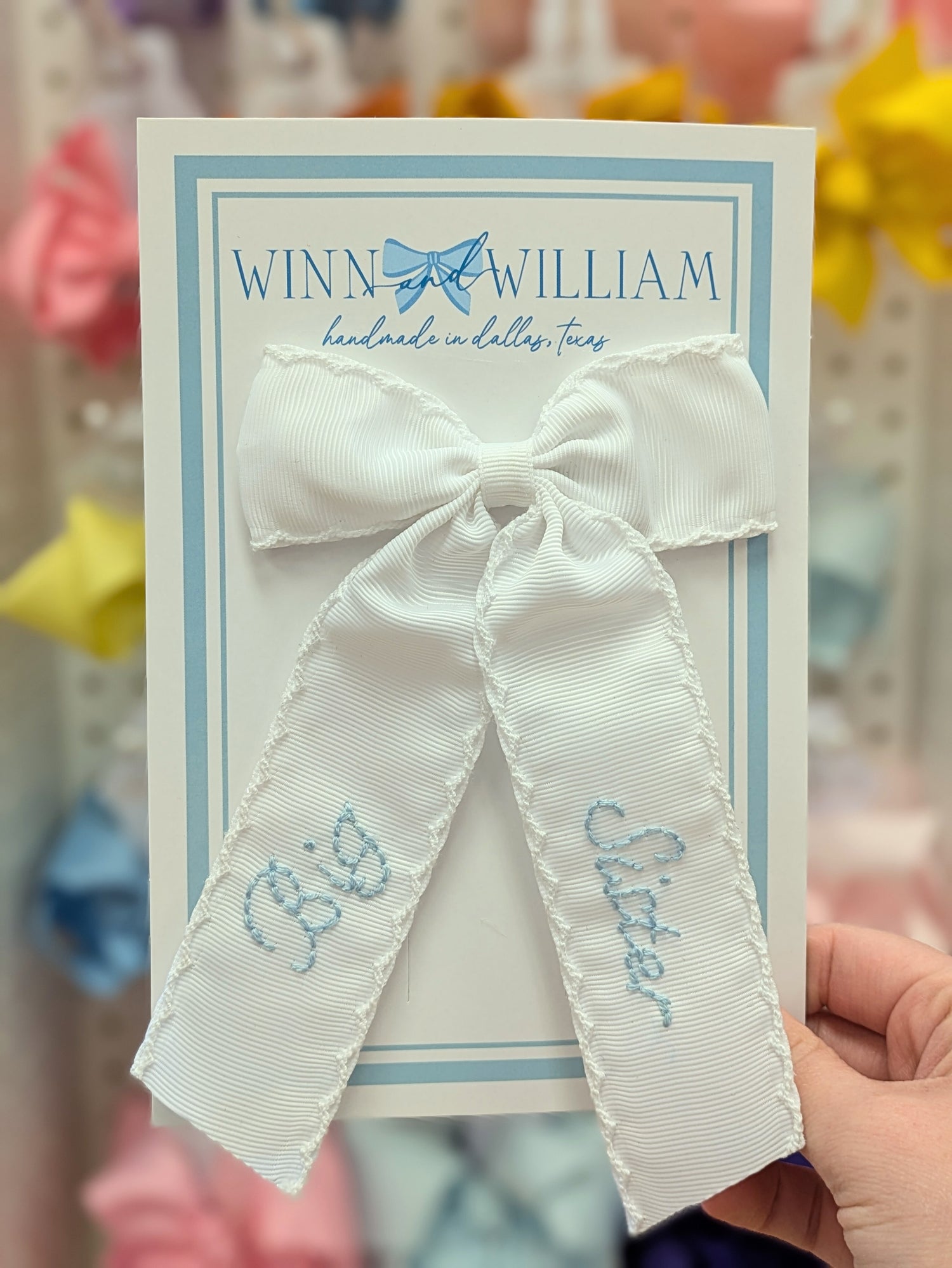 Medium White Moonstitch Big Sister Blue Bow