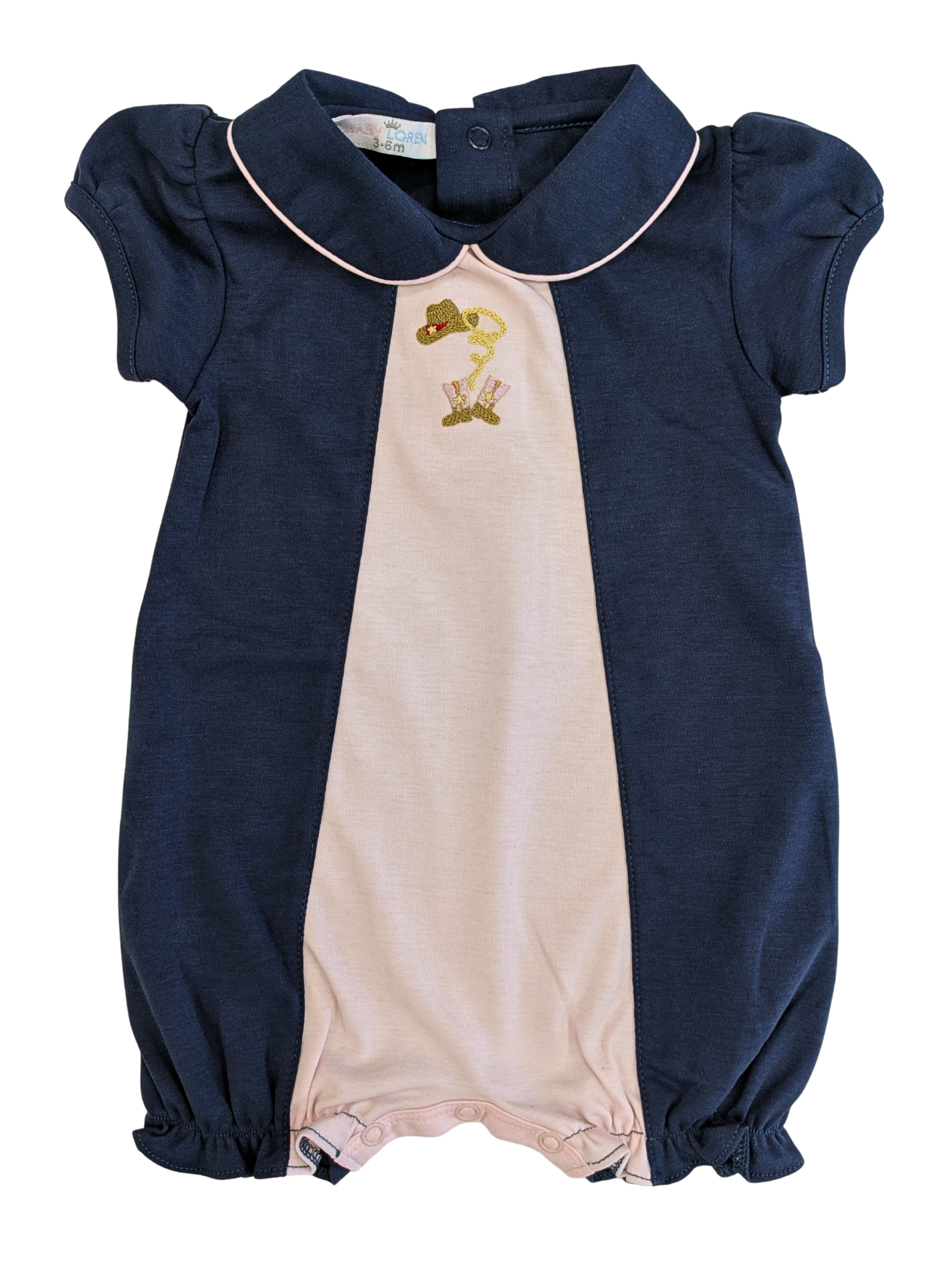 Saddle up for style with this charming pink and navy bubble featuring hand-embroidered boots and buckles! Perfect for the little cowgirl who loves all things rodeo, this playful piece combines Western-inspired details with cozy soft fabric. The bubble silhouette offers easy movement for active play, while the adorable boot and buckle embroidery adds personality and flair. A delightful choice for themed parties, playdates, or everyday adventures with attitude!
