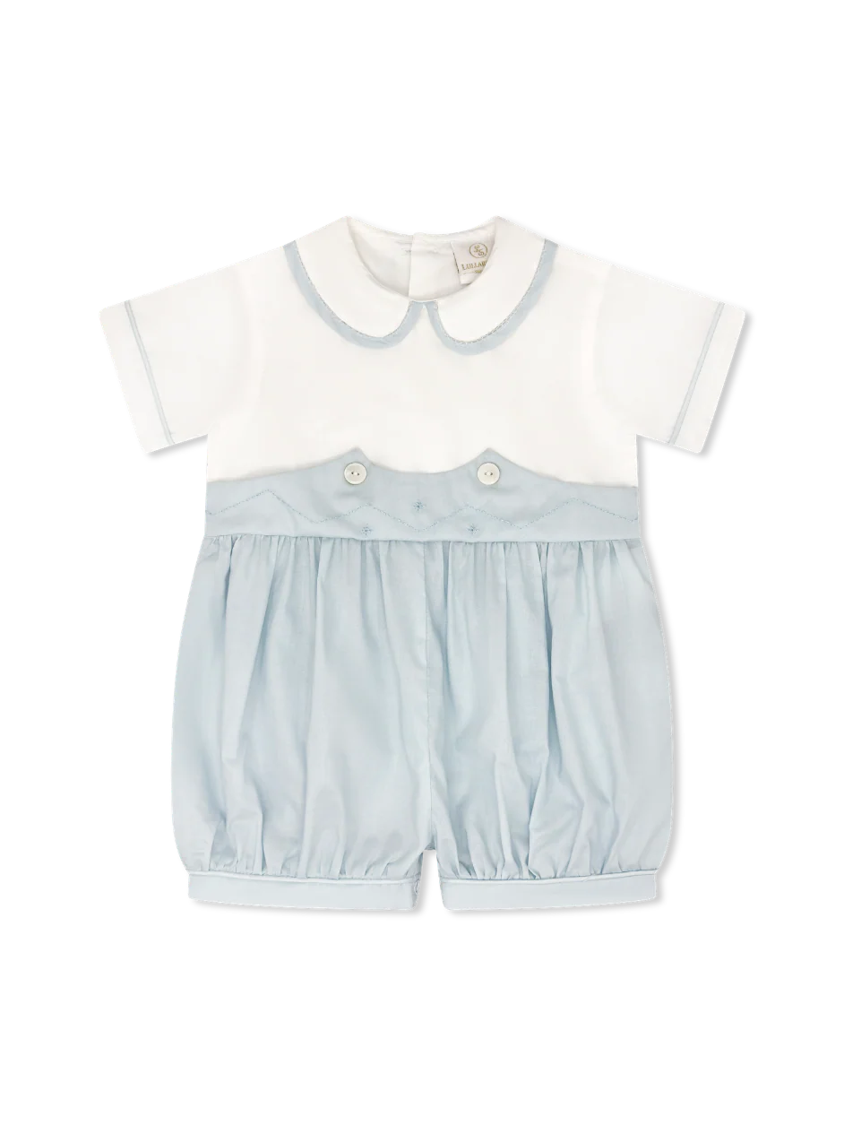 Timeless elegance for your little one's most special moments. The Sunday's Best Bubble features a Blessings White top with delicate diamond stitching details, paired with a soft Blessings Blue Batiste bottom.
