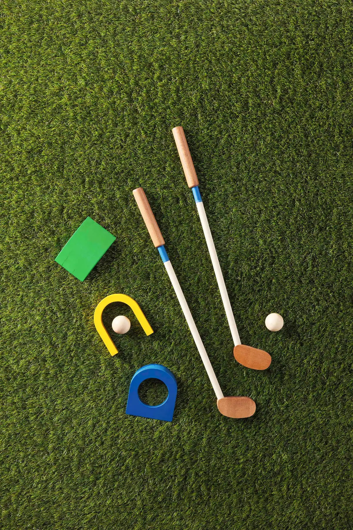 Help your little one learn hand-eye coordination with our Toy golf set. The seven piece set comes in a mesh bag for easy storage. The set includes two wooden putters and two balls. The set also comes with two obstacles and one hole. This toy set is intended for ages 3 and above.